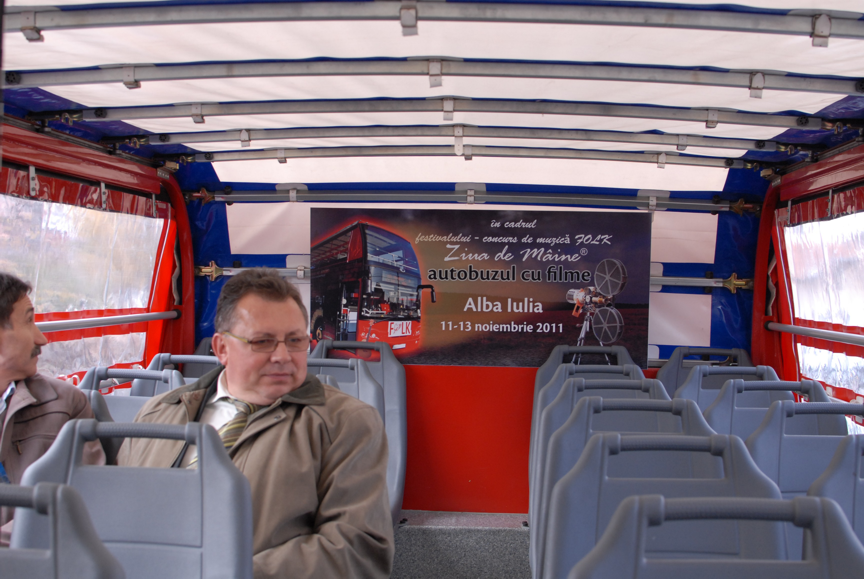“Autobuzul cu filme” a plecat azi din staţia festivalului de folk “Ziua de mâine”. Zi de zi, între 11 şi 13 noiembrie, pe parcursul celor trei zile de festival, vor avea loc proiecţii de film în autobuzul supraetajat al firmei locale de transport STP. Cumpărând un bilet de autobuz la preţ normal, albaiulienii vor putea urmări pe durata călătoriei lor filme de scurt metraj. “Superman”, “Spiderman sau Batman”, “Cronica unei morţi amânate”, “Trenul foamei”, “TIFF – making of”, “Nunta lui Oli” sunt producţii ce au adunat multe premii naţionale şi internaţionale, puse la dispoziţie de Asociaţia RYMA, TIFF şi Libra Films.
